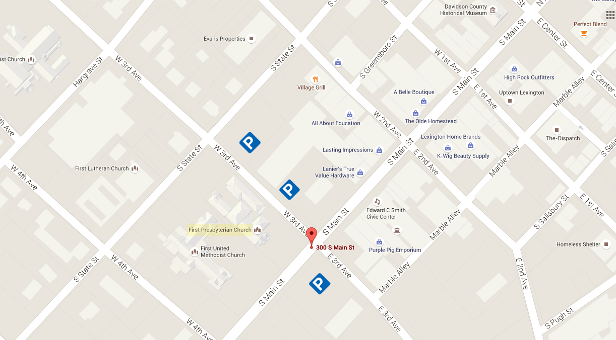 Parking for First Presbyterian is available in our parking lot at the corner of South Main Street and East Third Avenue (across Main Street from the front of the church), in the parking lot of the former Arts United (across West Third Avenue from the church’s side entrance), in the parking lot of Lanier’s Hardware on the corner of State Street and West Third Avenue, and along Third Avenue and South Main Street.